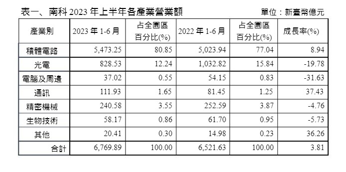 延續2022年南科穩健的營運佳績,2023年上半年在積體電路產業支持下,南科營業額達6,769.89億元,較2022年同期成長3.81%,持續締造歷年同期佳績;貿易總額5,706.07億元,成長10.05%,係因旗艦大廠持續擴產,並進口設備帶動相關需求,爰進口額3,108.34億元,亦成長28.40%;就業人數達91,996人,較2022年同期增加313人。