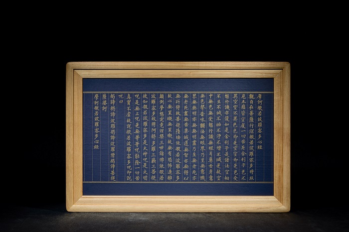 (二)、觀世音菩薩普門品《靈山法會》與《摩訶般若波羅蜜多心經》明人書 (共二幅) :《普門品》是《法華經》中的一品,藉由無盡意菩薩帶頭提問,釋迦牟尼佛在此品宣說觀音菩薩能「聞聲救苦」、「普門示現」,兩幅畫心出自明朝宣德七年觀世音菩薩普門品的《佛說法圖》與《心經》。此部是明代宮廷司禮監所製作,經文採明初大書法家沈度(1357-1434)的書風,他的書法典雅秀媚,被永樂皇帝稱為「我朝王羲之」,成為之後宣德、正統等朝宮廷寫經的審美風尚。此件是故宮院藏罕見的宮廷寫本,無疑也是品質最好的一件,反映了明代宮廷寫經的高度水平。