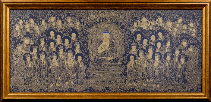 (四)、《大方廣圓覺修多羅了義經》之《佛說法圖變相》-明人泥金繪:全經主要說明大乘圓頓之理及如何觀行實踐之法。此部卷首為描金「佛說法圖」扉畫,佛陀髮髻以藍色標出,佛頂飾以白點,佛身袈裟亦具有紋飾,周繞四大天王、天龍八部,以及《圓覺經》十二菩薩,呈現明代宮廷漢藏佛教融合藝術的特徵。