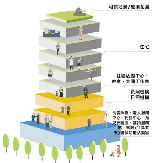 在設計上兼具賦能與康養旅居優勢,達到居家生活、在地安養、促進健康、終身學習等多機能目的,結合內外共生圈能夠提供多種居住模式, 讓不同偏好的使用者都能得到最適合的生活方案,並能靈活組合,滿足各種服務需求,達到全齡適宜的共融生活場域。