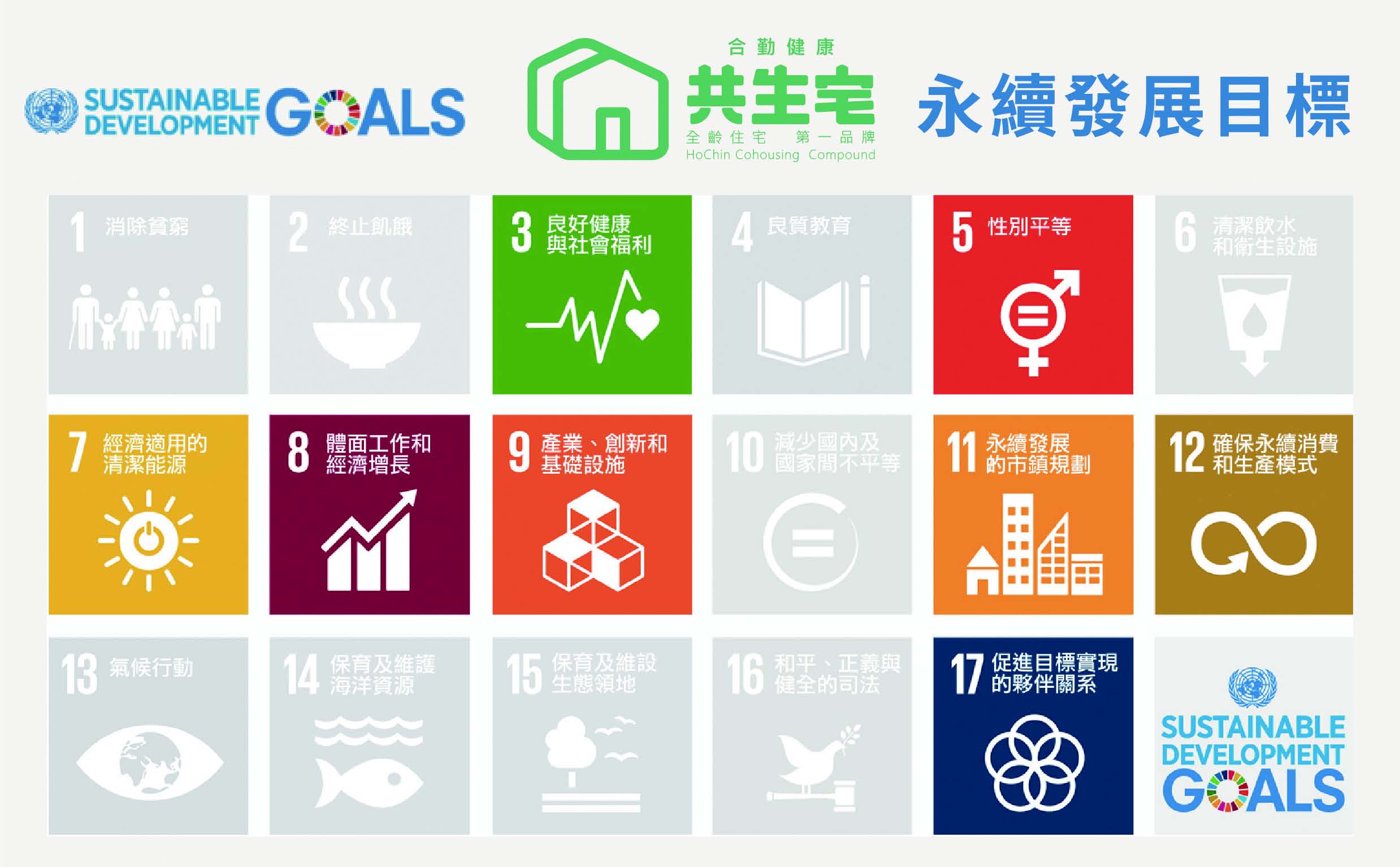 SDGs17項目標中的8個項目是合勤共生宅一直以來努力的方向,再從169 項細項目標梳理出19條子目標執行,同時共生宅也符合ESG的經濟成長、社會進步及社會責任、環境保護等,據此落實在共食、共遊、共學、共創、共好等聯動面向。以共食為例,與共生宅的愛自然、彩色曼陀羅咖啡、73號手作烘焙坊等品牌聯動,並連結在地小農、回收水資源的環保皂的製作、環保材料(包括容器、溶劑)、回收油再利用等。