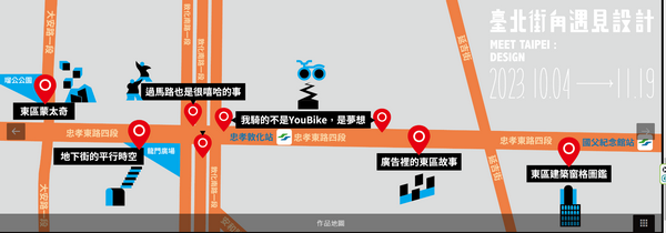 文化局自2013年起執行「臺北街角遇見設計」走遍臺北各地,在城市空間中透過各種創意視角,重新述說城市的生活故事。今年舞台來到了承載臺灣流行文化的「忠孝東路商圈」,在臺灣經濟起飛年代形成的東區,從一切最新的城市建設、商業公司、時尚前線的服裝百貨,到街巷裡溢出的青春活力,在忠孝東路的街頭充滿了各種故事與跨界色彩。今年活動以「東區,直直走」為主題,帶大家來到全臺灣最著名的大道之一:忠孝東路,並網羅平面設計、拼貼圖像、插畫、剪紙設計、劇場等6組跨領域設計師們攜手創作。透過他們的創作視角,以各異其趣的街頭裝置作品,橫跨各個時空節點,結合過去的故事與當代面貌,打造似曾相識卻與眾不同的新東區記憶。