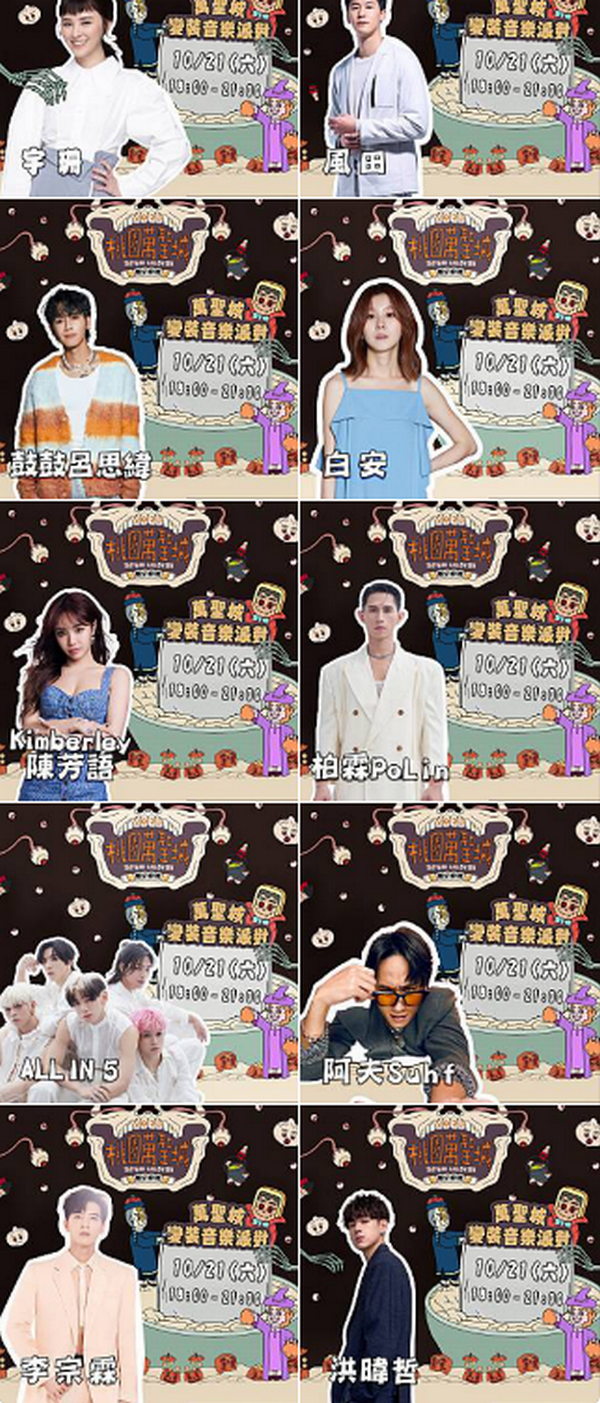 「萬聖變裝音樂派對」將由甜美女星-宇珊和日籍男星-風田共同主持,並邀請重磅卡司包含鼓鼓 呂思緯、Kimberley陳芳語、白安、柏霖PoLin、洪暐哲、ALL IN 5、李宗霖和阿夫等8組藝人盛裝亮相,為桃園萬聖城-魔幻廚房揭開序幕、嗨翻全場!
