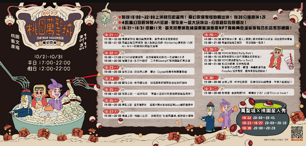 「2023桃園萬聖城─魔幻廚房」將於10月21日至10月31日在桃園藝文廣場盛大舉行,為期11天歷年最長的萬聖節活動,首日邀請多位實力派歌手熱情開唱,化身超炫角色登場同歡!