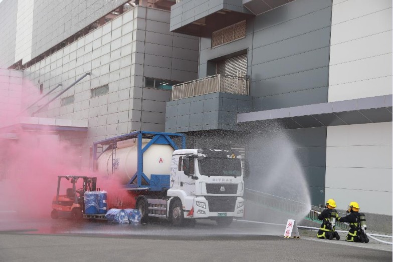 消防局演練撲滅堆高機與槽車擦撞引發之火勢