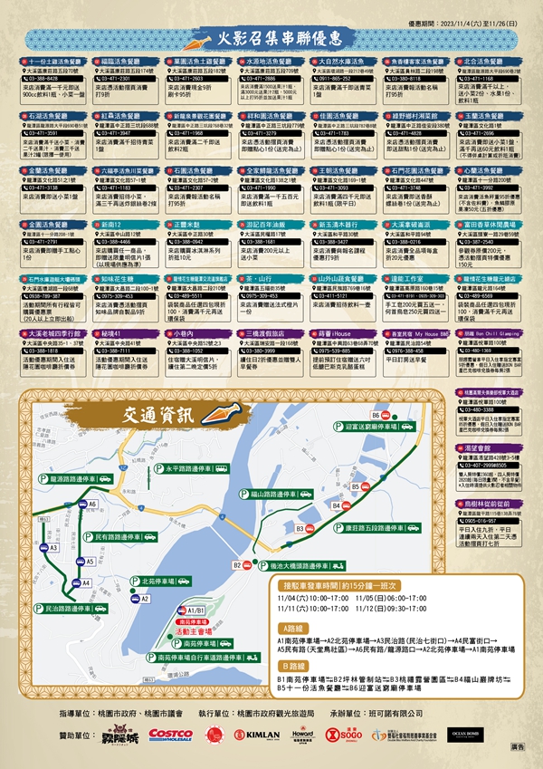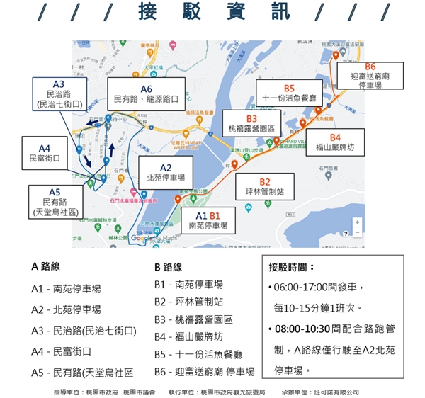 活動期間配合周邊停車區位規劃有A、B路線免費接駁車服務,將於上午6時至下午5時間發車,約10-15分鐘1班次。「A路線」為龍潭區民治路及民有路一帶至南苑停車場之往返,接駁點包含南苑停車場、北苑停車場、民治路(民治七街口) 、民富街口、民有路(天堂鳥社區)、民有路/龍源路口。「B路線」為迎富送窮廟停車場至南苑停車場來回接駁,接駁點包含南苑停車場、坪林管制站、桃禧露營園區、福山巖牌坊、十一份活魚餐廳、迎富送窮廟停車場。另上午8時至10時30分期間配合路跑管制,A路線暫僅行駛至北苑停車場。更多相關停車與交通接駁資訊可參見活動官網:https://www.tycg-anime-run.com/transportation查詢。