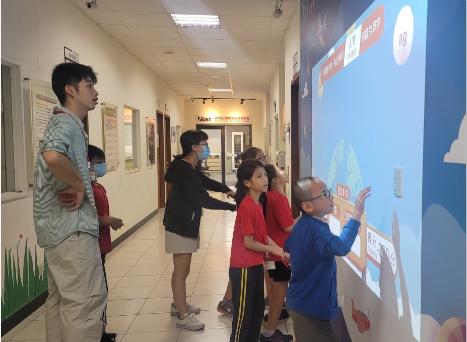 明新科大雙語教育中心執行雙語數位學伴計畫,大學伴與大湖的栗林國小小學伴一起玩「雙語互動牆」的英文破關遊戲