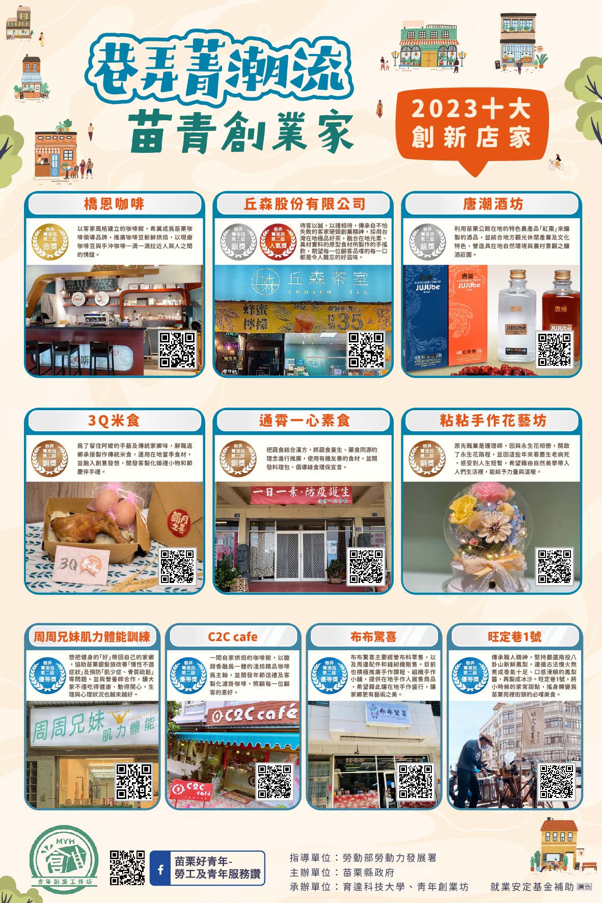 「巷弄菁潮流 苗青創業家」第二屆青年創新店家選拔活動得獎店家,分別為金獎1名橋恩咖啡;銀獎2名丘森股份有限公司、唐潮酒坊;銅獎3名3Q米食、通霄一心素食、粘粘手作花藝坊;優等獎4名周周兄妹肌力體能訓練、二張商行、布布驚喜、旺定巷1號;以及經由網路票選出的人氣獎1名丘森股份有限公司。