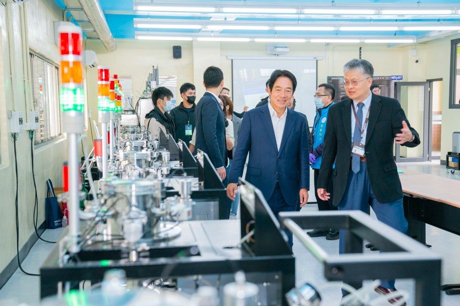 明新科大半導體人才培育基地啟用,副總統賴清德(左)親臨揭牌並由明新科大校長劉國偉(右)陪同參觀基地設備。