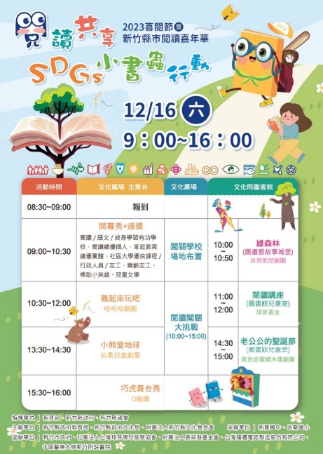縣府教育局表示,星球守護行動活動於文化廣場上午9時至下午3時進行SDGs主題趣味闖關。同時小書蟲們將在主舞台翩翩起舞,哇哈哈劇團、如果兒童劇團、O劇團帶來精彩的閱讀劇場。公共圖書館精彩活動包含職棒好手李振昌帶來閱讀講座、中醫大新竹附醫院醫師現場諮詢、戲團表演、文創市集等多項系列活動,歡迎大家帶著好奇心一同參與閱讀嘉年華。