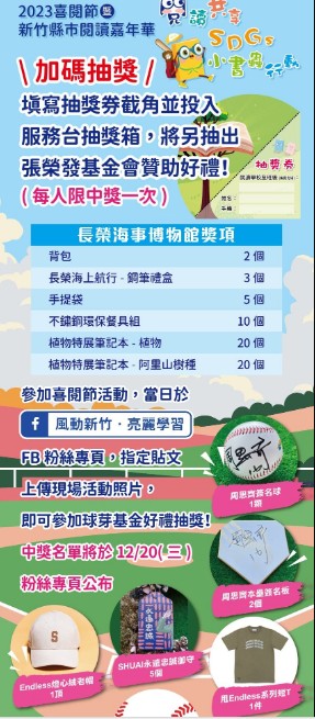 教育局為感謝大家對活動的支持,好禮再加碼!活動當天於FB粉專上傳小書蟲守護行動的活動照片,即可額外參加驚喜好禮抽獎,邀請您和小書蟲一同共度一場奇幻的閱讀冒險!相關訊息請至新竹縣教育局網站或「風動新竹 亮麗學習」Fb粉絲專頁查詢。
