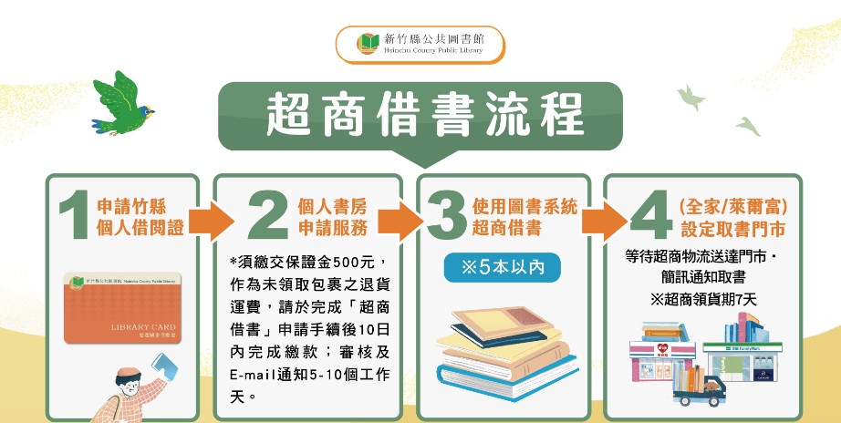 縣府文化局長李安妤表示,使用超商借還書服務非常簡單,只需申請新竹縣公共圖書館借閱證,到「新竹縣公共圖書館」網站(https://hcplibrary.hchcc.gov.tw/wSite/mp?mp=1)登入個人書房,申請超商借書服務,並繳交保證金500元,即可開通服務。借閱書籍由物流配送至指定超商門市後便可取書,每一包裹物流費分別為全家超商50元、萊爾富超商47元。還書則是到全家超商FamiPort或萊爾富超商Life-ET服務機台,選擇「圖書館還書」,並依照一般寄件流程即完成,物流費每件45元。