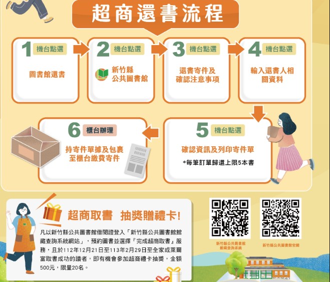 文化局表示,超商借還書服務即日起開通,民眾可借閱新竹縣公共圖書館藏書,日後將會陸續推展至鄉鎮市圖書館,服務範圍為本島,以全家超商、萊爾富超商物流服務涵蓋範圍為主。為鼓勵民眾多多利用,即日起至113年2月29日間,至全家超商或萊爾富超商使用「超商取書」服務的讀者,即可參加抽獎,預計113年3月中旬抽出500元超商禮卡20名。得獎名單將於線上抽獎完成後,隔日公佈於文化局臉書粉絲專頁。
