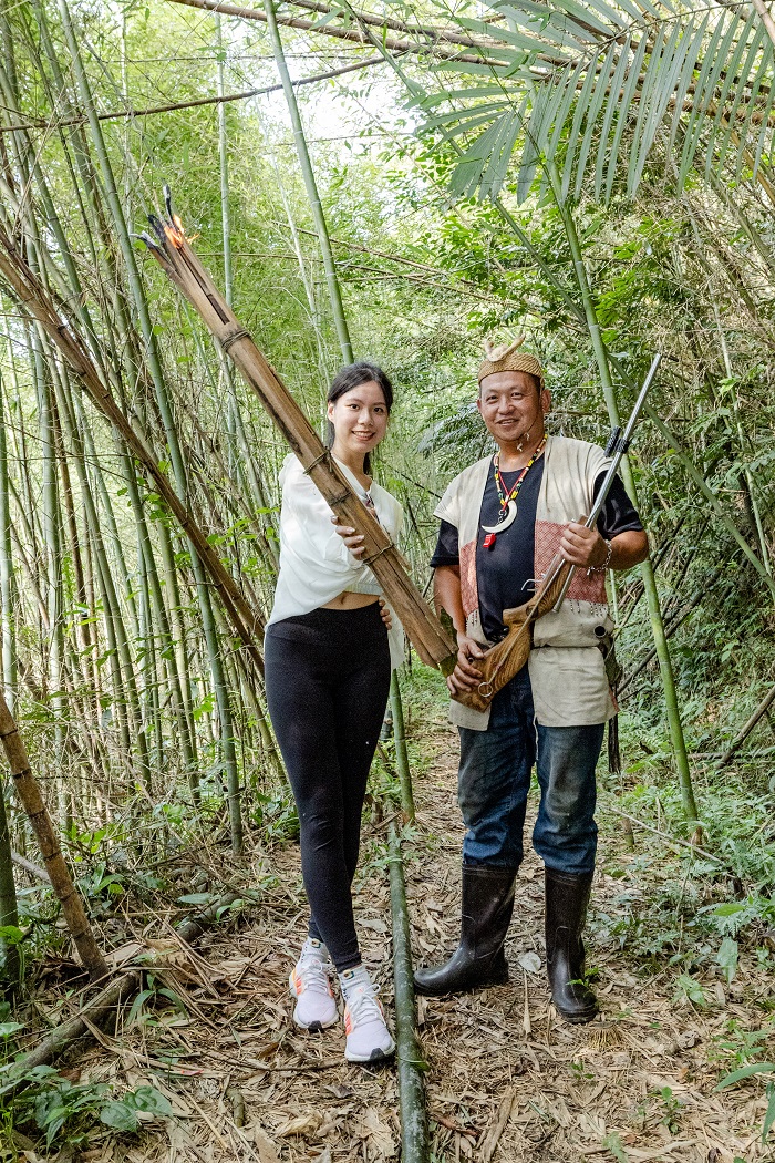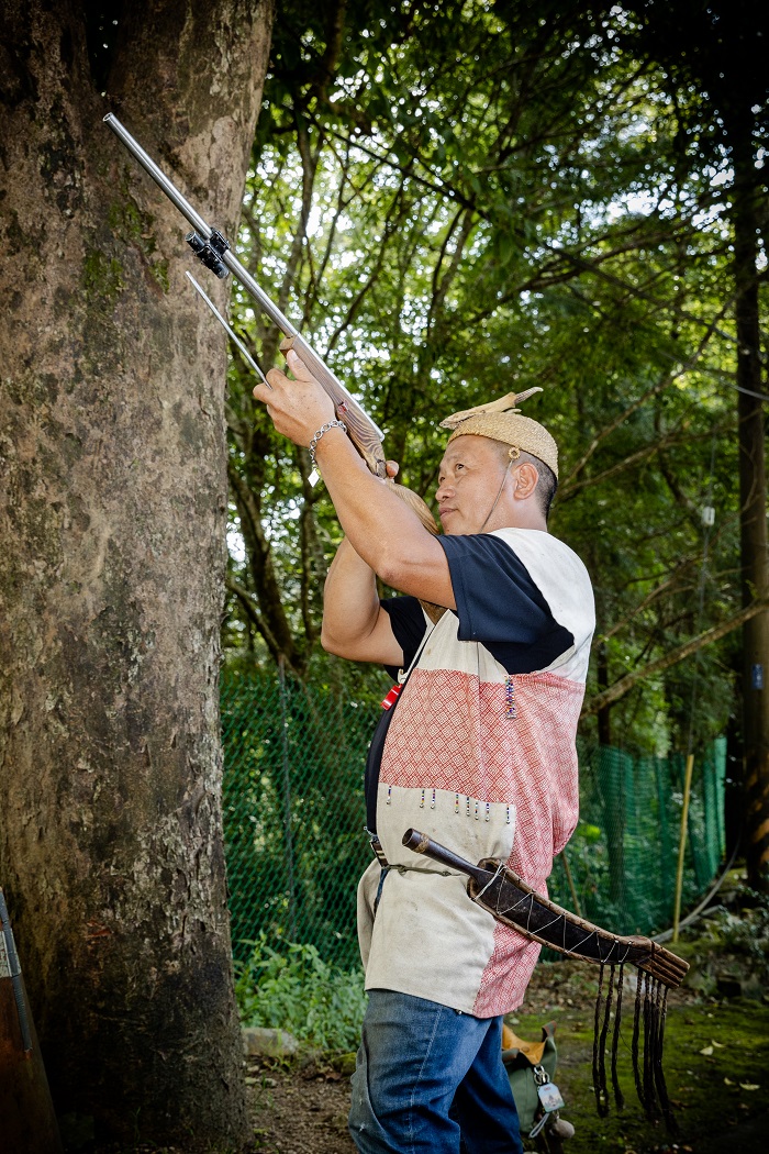 著泰雅獵人裝扮的導覽員羅老師,展示泰雅族獵槍時,突然朝天瞄準發射,子彈射出的聲音把團員都嚇了一大跳!