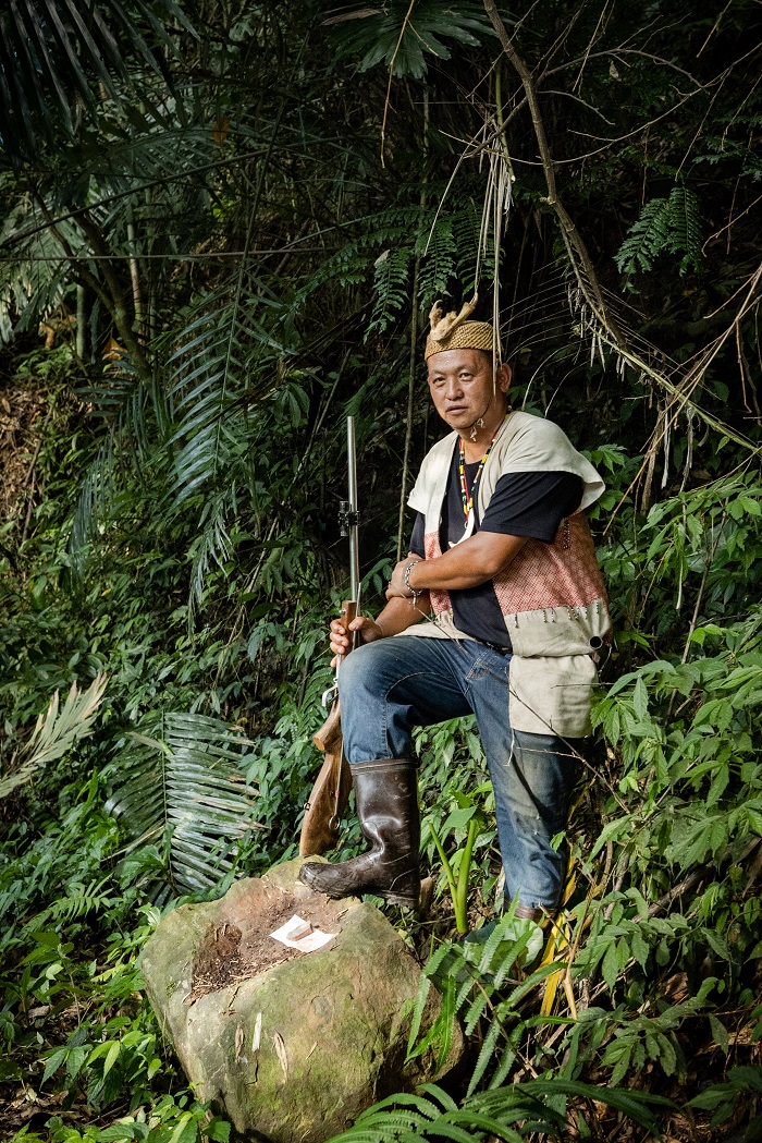 著泰雅獵人裝扮的導覽員羅老師非常健談幽默,水圳古道在其導覽下生動又有趣。他說獵人會把打過、最得意的獵物裝飾在身上,像他帽子上的是山羌,身上還掛有山豬獠牙等!
