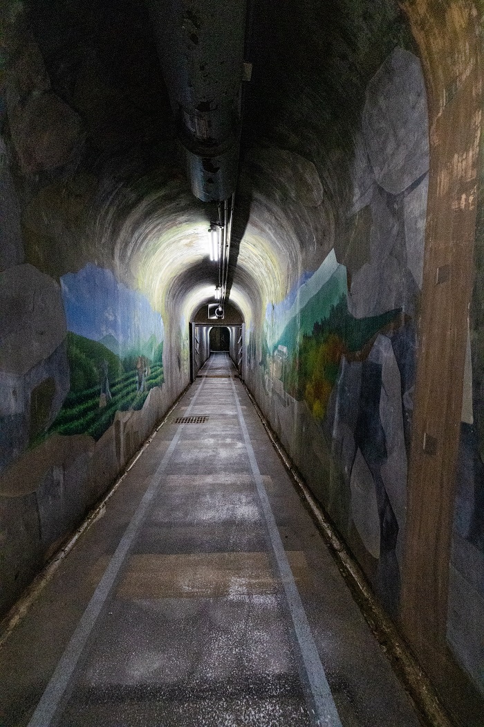 角板山行館曾為先總統蔣公與其夫人蔣宋美齡居住之行館,館內有豐富的圖像及影音史料。戰備隧道建於1963年,總長約100公尺,用於戰事爆發時保護國家元首安危,並對外下達作戰指令。沿著階梯一路下行,我們走進地下20公尺深的隧道,100公尺長的隧道壁面,繪有互動式3D立體壁畫,營造50年代的軍事場景。
