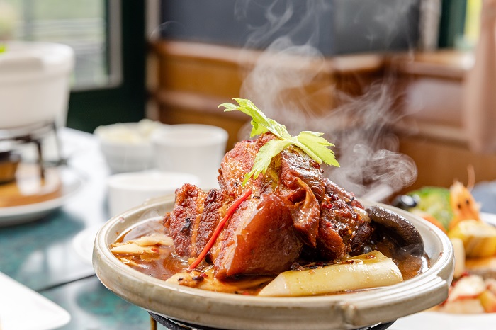 TINA廚房主餐有多元選擇,推薦復興區特產的桂筍控紅燒肉、自家招牌川味醬燒水煮豆花牛肉(麻辣)。