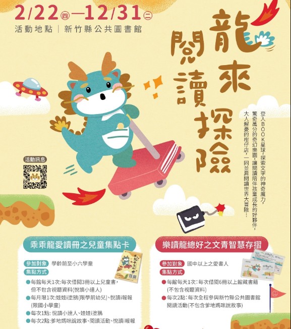 廣受大小讀者喜愛的「龍來探險閱讀集點活動」來囉!新竹縣公共圖書館今年度特別以生肖「龍」為主視覺,推出「乖乖龍愛讀冊-兒童集點卡」、「樂讀龍總好-智慧存摺」等集點活動,自2月22日起正式起跑,邀請大小愛書人共享書本樂趣,厚植閱讀力,打造竹縣遍地書香。