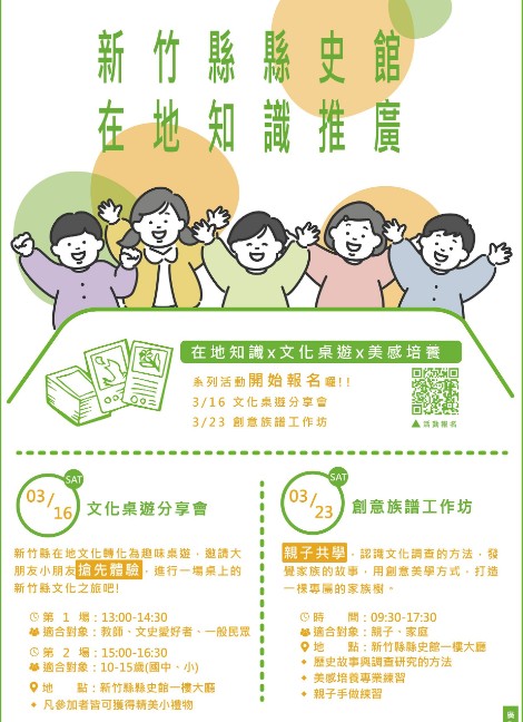 新竹縣政府文化局縣史館舉辦在地知識推廣系列活動,「文化桌遊分享會」及「創意族譜工作坊」分別在3月16日及23日登場,希望大小朋友透過趣味且多元的文化體驗來認識在地知識,歡迎民眾踴躍報名參加。