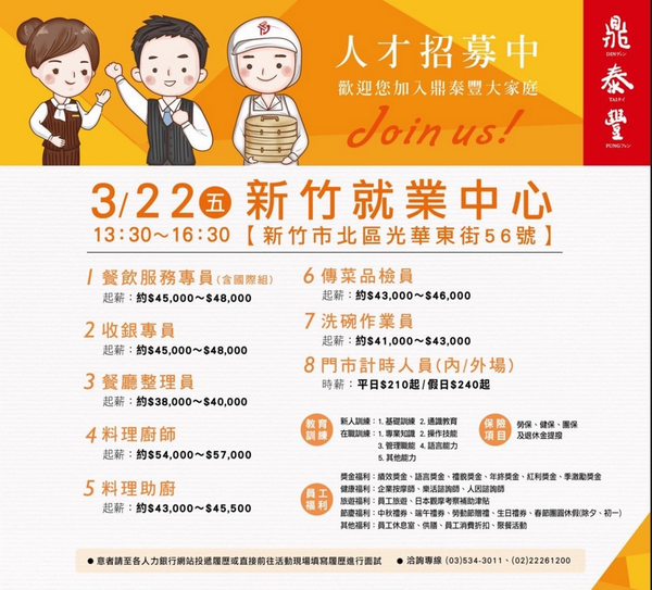 參與廠商有鼎泰豐、米塔、寶雅、全聯、香繼光、大魯閣及愛買共7家釋出近400個職缺,其中鼎泰豐與新竹就業中心合作專案招募,現場規劃企業介紹專區及現場面試,邀請新竹店主管及人資主管出席,開出包含餐飲服務專員、收銀專員、料理廚師、傳菜品檢員、內(外)場服務人員等125個職缺,薪資最高可達57K,而餐飲服務專員本次釋出50個職缺最多,想投身鼎泰豐工作並了解工作內容的民眾可把握此次直接洽談的機會。