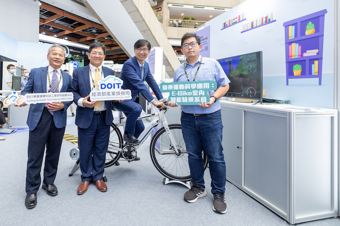 於「創新領航館」展出的「E-Bike室內智能騎乘系統」,為經濟部產業技術司攜手自行車暨健康科技工業研究發展中心共同研發,整合運動科學、感測及控制技術,透過踏頻、功率、坡度、心率等數據,取得並分析個人騎乘運動 狀態,並轉換成為室內訓練的指導參數,透過虛擬教練APP獲得即時指導,將戶外騎乘使用的電動輔助自行車轉換為室內訓練之用,達到精準個人化的訓練目標。