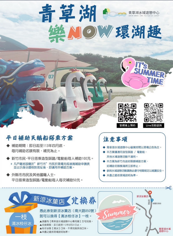 城銷處表示,《青草湖樂NOW環湖趣》平日補助民眾搭乘天鵝船優惠,原訂4月底截止,但民眾反應良好,市府特別加碼延長至6月底,補助設籍竹市的市民,只要於現場填寫補助表單,並出示證件核對,即可享平日搭乘天鵝船每人一次100元的優惠,之後每次搭乘還可以補助50元;外縣市遊客亦可享每人每次50元補助優惠,平日補助名額有限,每月額滿即截止。