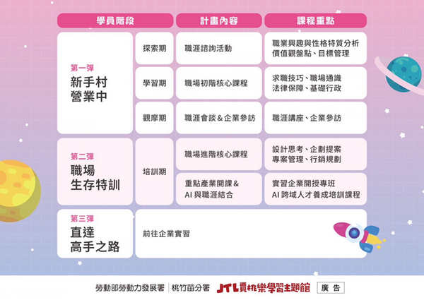 Mission J:企業實習計畫區分三階段任務,第一彈「新手村營業中」,提供職涯諮詢及職場初階核心課程,並搭配職涯會談及企業參訪等活動,協助學員進行職涯探索並打造個人發展計畫。第二彈「職場生存特訓」進一步提供進階核心課程,特別邀請財團法人人工智慧科技基金會設計AI產業跨域人才培訓課程,以滿足當前市場對AI及多元化專業知識的需求,並結合相關企業規劃專業培力課程,內容涵蓋最新的行業趨勢和實務技能,全面提升職場競爭力。第三彈「直達高手之路」,將為參與者媒合企業見習機會,與GOLF學用接軌聯盟合作,針對台灣知名AI相關產業企業以及重點產業,提供超過500個實習職缺,實際踏入職場,學以致用,協助求職青年實現職涯目標與成長。