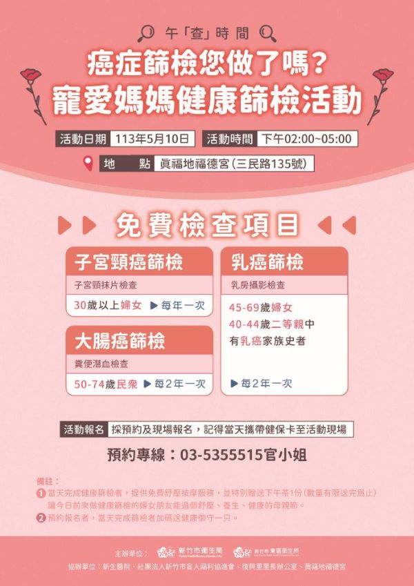 母親節即將到來,新竹市衛生局攜手東區衛生所,將於5月10日14時在真福地福德宮(三民路135號)舉辦『午「查」時間,癌症篩檢您做了嗎?』寵愛媽媽健康篩檢活動。衛生局表示,媽媽們只要參加此次健康篩檢活動,市府即贈免費午茶及紓壓按摩體驗,表達對母親們誠摯的祝福,檢查項目為30-69歲子宮頸抹片檢查、45-69歲乳房攝影檢查、50-74歲大腸癌篩檢。歡迎市民朋友陪著妻子、媽媽一起來篩檢,還能享受下午茶及紓壓按摩,寵愛媽媽全家動起來。