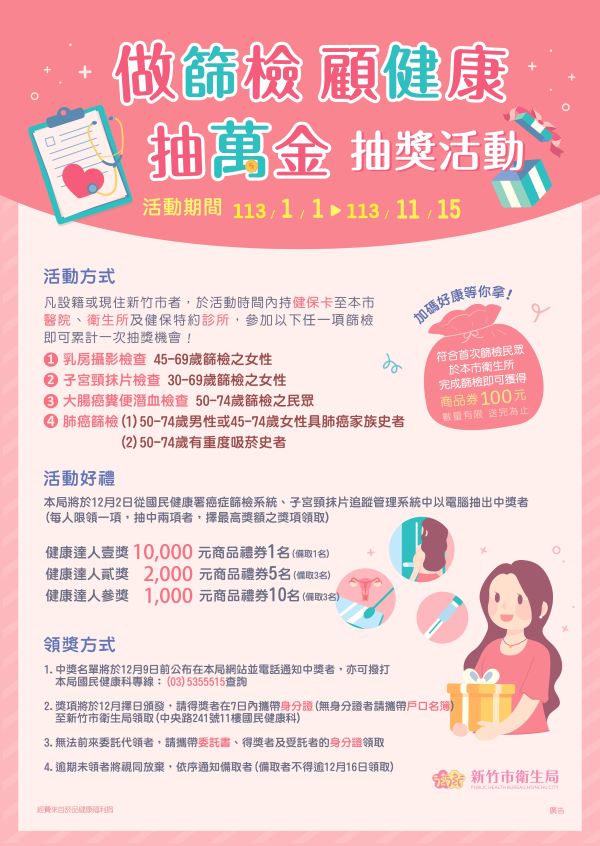 衛生局表示,凡設籍或居住於竹市,若符合子宮頸抹片6年以上未做、乳癌、大腸癌及肺癌首篩的民眾,以及於今年年11月15日前完成一項癌症篩檢者,均可參加「做篩檢、顧健康、抽萬金!」抽獎活動,最大獎一萬元禮券,獎項豐富,邀請民眾踴躍參加。活動相關資訊可洽竹市三區衛生所或衛生局網頁( https://reurl.cc/ykVnZq )查詢。