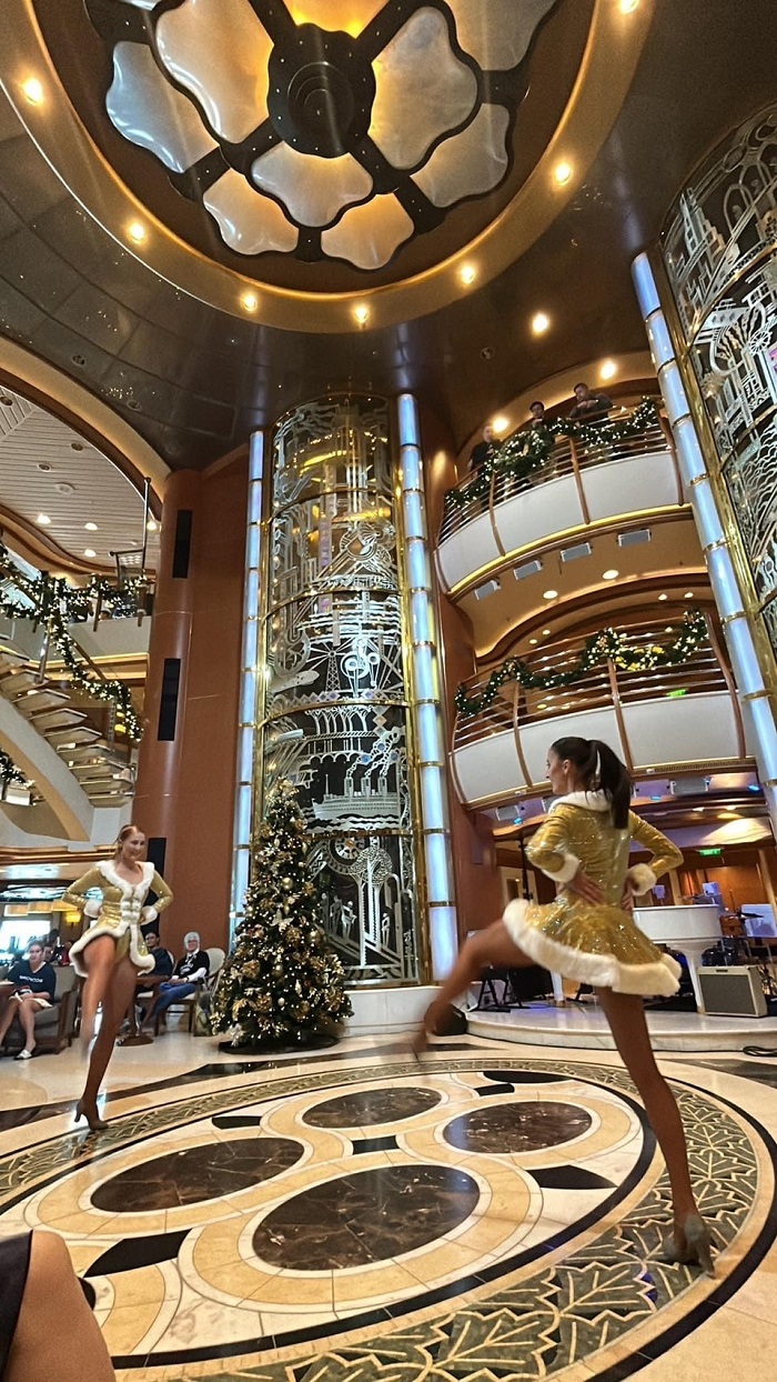 住在5樓最方便的是,豪華的中庭每日午晚都有古典和現代音樂的專業藝人表演,也有免費的下午茶(酒水需要付費),甚至有藝廊販售國際水準的畫廊可欣賞,郵輪上不同樓層有各種陸上運動和水上活動可以使用,包括免費的乒乓球、健身房、國標舞教學以及付費的SPA都有。每天可以收到服務人員打掃後,放在床上給不同樓層和空間舉辦各種活動的英文版節目單。