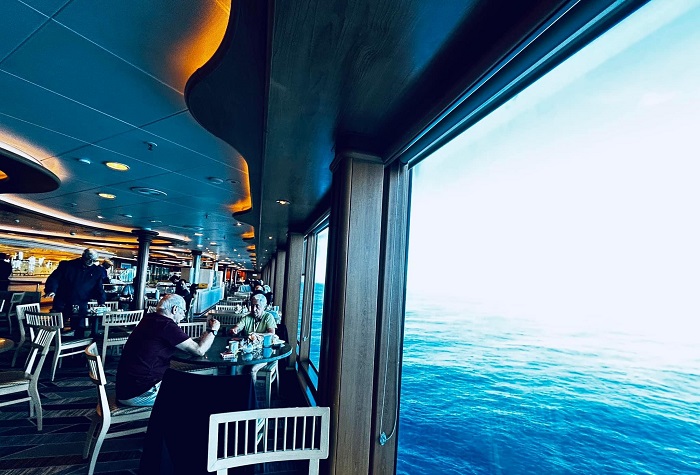 台灣5人組除了晚餐會聚集到指定餐廳外,其餘時間新竹3人組會約好一起用餐。餐廳內有來自各國入士,每個人都會因座位和時間的不同,各自會認識一些包括中國人在內的異國人士。大家都很客氣、優雅和有禮,台灣旅客不太多,我想是因為時間太長,除了退休人員,沒有人有這麼長的休閒時間。倒是有一些旅居美國的中國人,第20天則有不少從智利上船的中國團客。