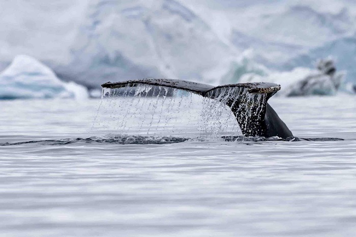 在拍浮冰時,幸運地看到兩條鯨魚一前一後在海面跳躍!