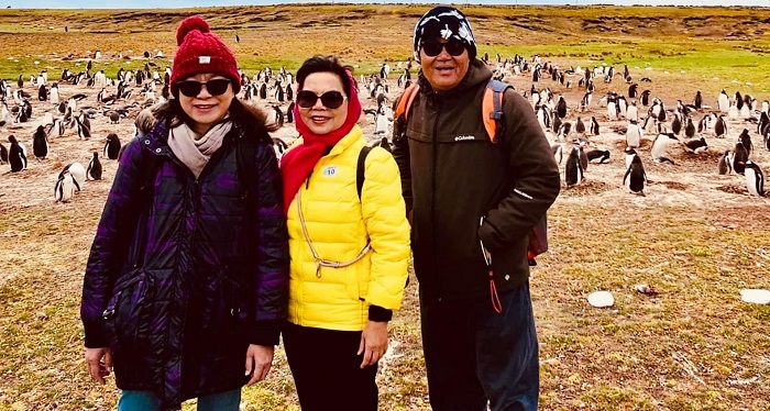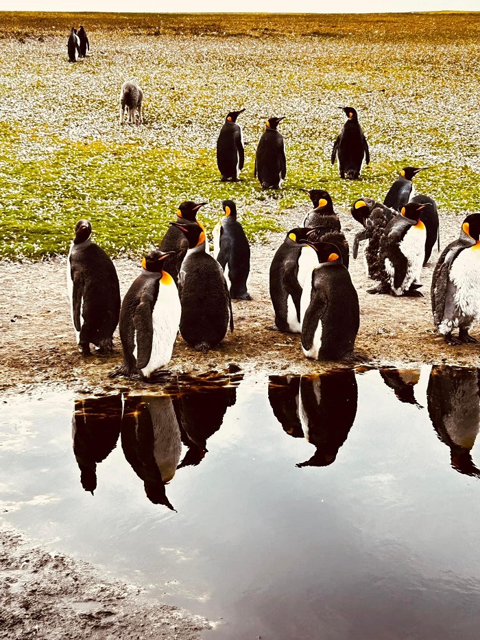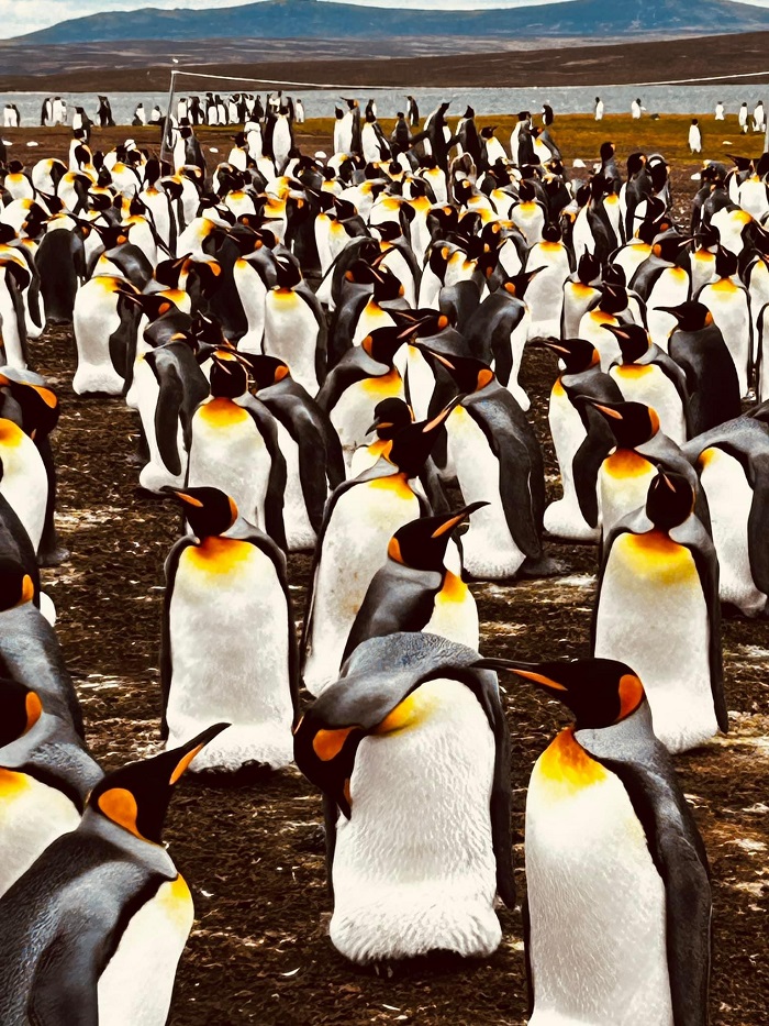 我們在幾個島上行程中,選擇非常期待的岸上行程:英屬福克蘭群島 (Falkland Islands)欣賞包括國王企鵝在內,至少三種以上的企鵝。英國人的規劃相當生態,只是用岩石放在地上圍一圈,一點都不阻擋人類和企鵝的互動,但是人們如果跨越岩石時,就會被工作人員提醒退出石頭範圍。因為當親眼看到這些呆頭呆腦的國王企鵝,搖搖擺擺走出岩石圈,自由自在的在人們身邊走來走去,真是大大的驚奇和驚喜!