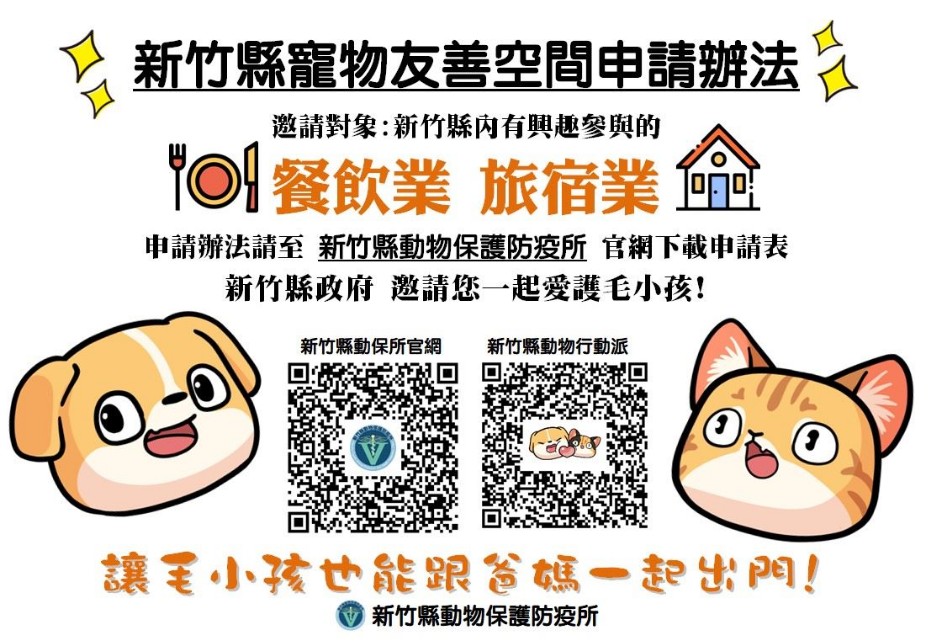 近年新竹縣飼養寵物風氣興盛,為了讓飼主們能夠方便帶著寵物外出用餐、住宿和旅遊,新竹縣政府特別推出新竹縣寵物友善空間計畫,鼓勵更多餐飲及旅宿業者加入寵物友善空間行列,通過寵物友善空間認證審查的商家名單及導覽地圖將公布在新竹縣動物保護防疫所官網,讓民眾方便查詢,歡迎符合資格的商家踴躍申請。