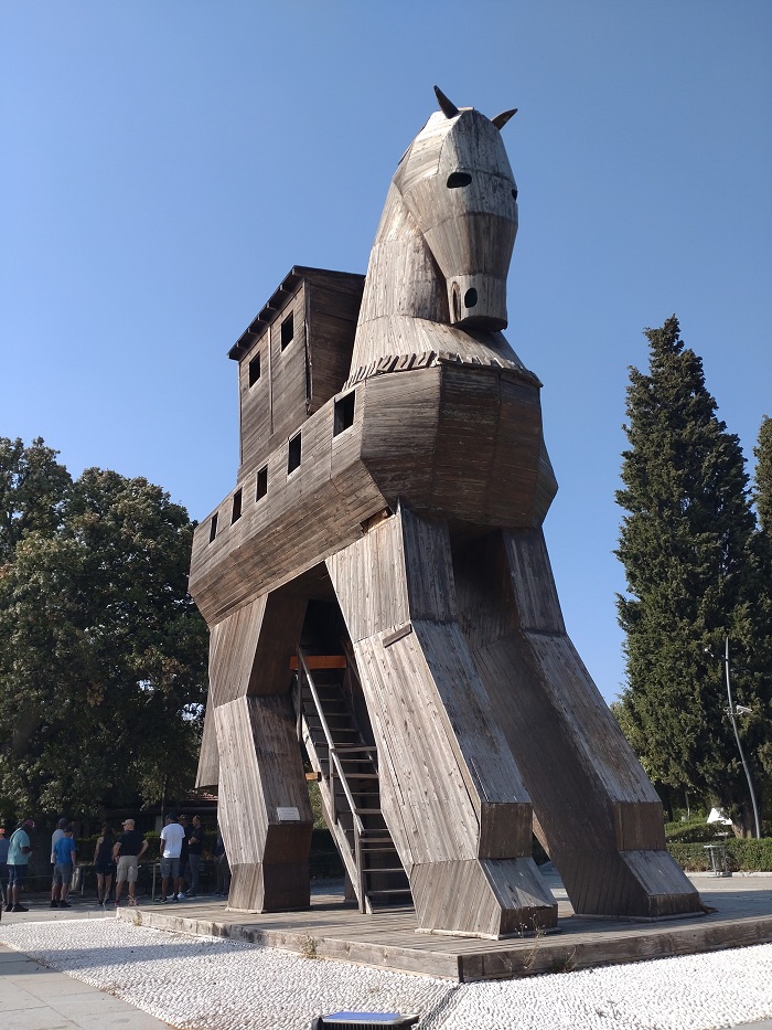 從佳泰土丘再往西北800公里,「愛琴海」邊另一處古蹟號稱是3千年前特洛伊城的遺址。為了發展觀光,在園區入口處矗立了一座3層樓高的大木馬,漫步遺址中的城牆與屋宇基座、耳聽古代最美女子「海倫」的傳說;然而觸目所及的斷垣殘壁只能讓人臆想前人的廝殺,卻無法感受到生活應有的美好與平靜。