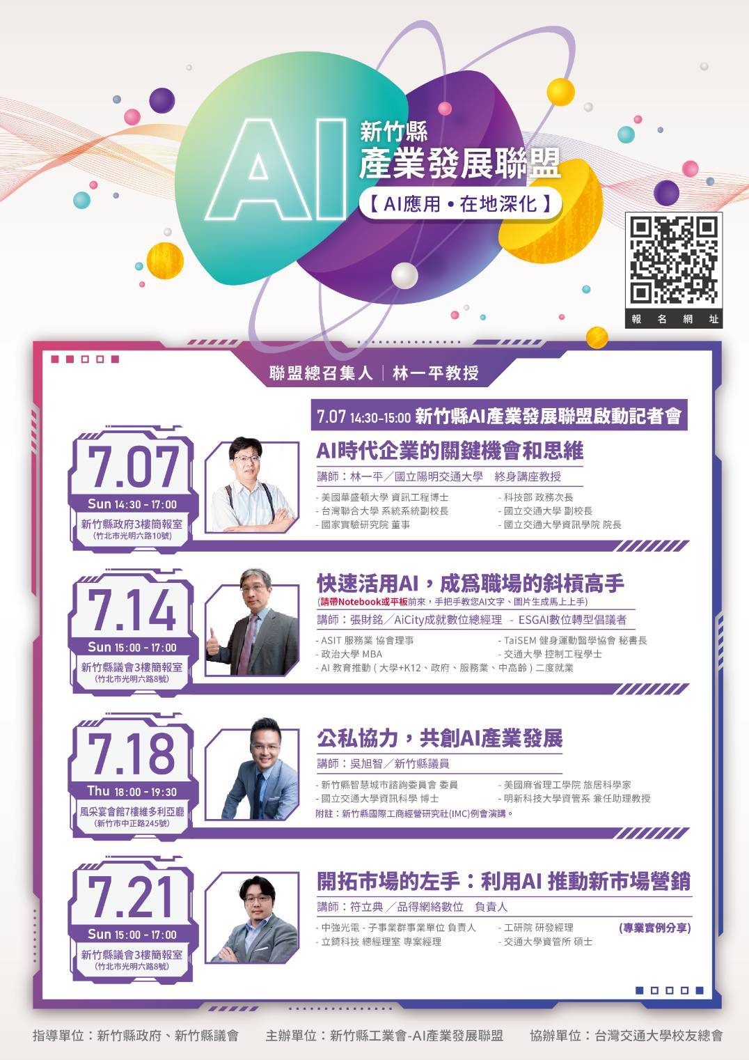 2024年7月7日下午2點半,由國立陽明交通大學終身講座教授林一平博士及新竹縣議員吳旭智博士共同發起,並由新竹縣工業會支持的「新竹縣AI產業發展聯盟」,假新竹縣政府三樓簡報室,以戳破氣球的啟動儀式,象徵AI產業發展聯盟正式誕生。儀式後即刻由聯盟總召集人林一平教授,演講「AI時代企業的關鍵機會和思維 」,與會民眾收獲滿滿!