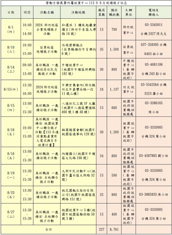 (https://www.taiwanjobs.gov.tw/) , 桃竹苗分署也將持續辦理各類主題式徵才活動,提供轄區雇主與求職者就業媒合平台,若想了解8月份各場次徵才活動時間,請洽本分署官網查詢。