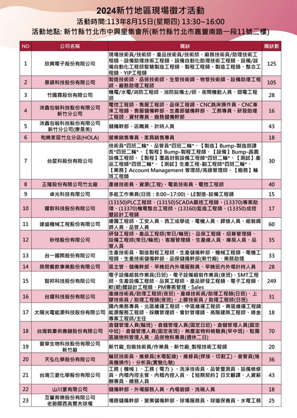 本次活動參與廠商包含科技製造業、餐飲服務業及零售業,為吸引青年朋友青睞,欣興電子招募設備、製程、製造、整合、YIP工程師,共計35個職缺數薪資上看70K;台燿科技招募助理工程師,薪資上看58K。其中,築間餐飲集團招募新竹縣竹北市區主管,薪資上看58K,歡迎有求職意願的民眾踴躍前往參加徵才活動。更多廠商訊息及職缺內容可電洽竹北就業中心(03-5542564),或上活動網站(https://gov.tw/tFh)查詢。