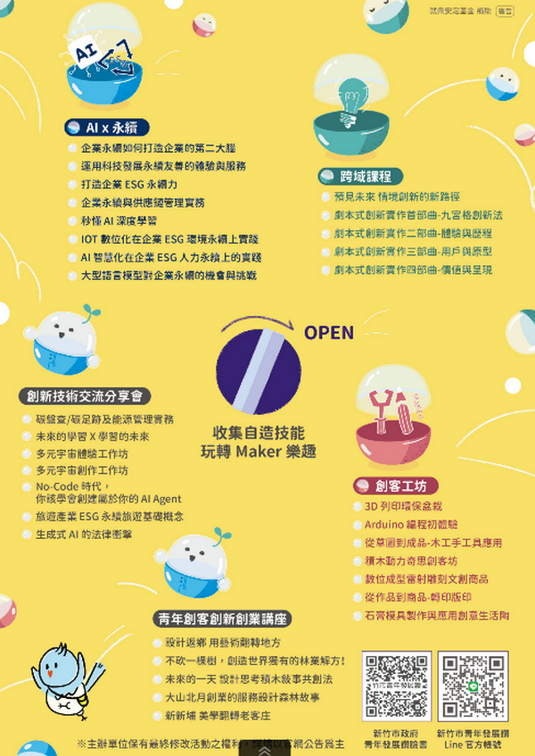 勞工處補充,市府10月底將與第十二屆梅竹黑客松合辦創客競賽,預計9月開放報名,歡迎全國創客及青年朋友組隊報名參加,一起收集自造技能,玩轉 Maker 樂趣。更多青年活動資訊,歡迎追蹤新竹市政府勞工處「青年發展讚」臉書( facebook.com/YouthHsinchu )。