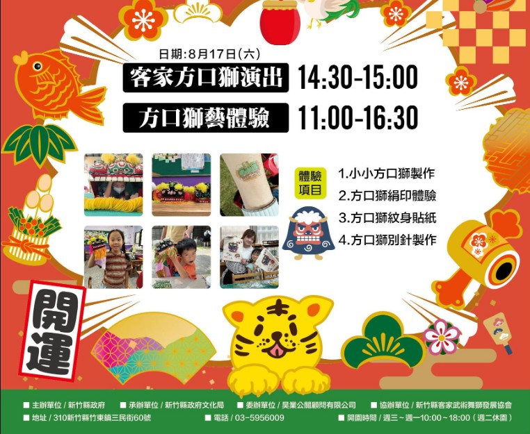 客家方口獅為客家特色之一,為了傳承及發揚,蕭如松藝術園區特別在暑假期間舉辦一場客家方口獅活動,包括方口獅的表演、方口獅製作與絹印體驗、方口獅紋身貼紙、方口獅別針製作等,將於8月17日上午11時展開,有興趣者均可前來共同參與。