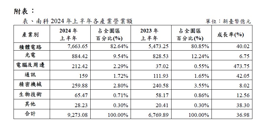 受惠全球AI熱潮,2024年上半年在積體電路產業的引領帶動下,六大產業全面復甦,南科營業額達9,273.08億元,較2023年同期成長36.98%,電腦及周邊產業更有達473.75%成長率,締造歷年同期最佳成績。
