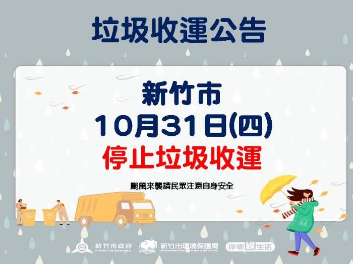 康芮颱風來襲 新竹市10/31停收垃圾 By 新聞中心 - 2024/10/31 667 康芮颱風來襲,新竹市今(30)日晚間宣布10月31日週四停止上班上課,新竹市環保局表示,為顧及市民及清潔隊員人身安全,10月31日停止收運社區子母車垃圾,以及沿線家戶垃圾、廚餘及資源物,提醒民眾暫時將垃圾貯存在家,不要排出且勿任意丟棄。環保局表示,請民眾多加利用新竹市政府網站、新竹市環保局網站與「新竹市清運車便民查詢網」( https://7966.hccg.gov.tw ),隨時掌握最新訊息。若對垃圾收運有疑問,歡迎撥打1999或洽詢環保局清潔隊(服務電話:5388406分機9)。 新竹市清運車便民查詢網停止垃圾收運 延伸閱讀