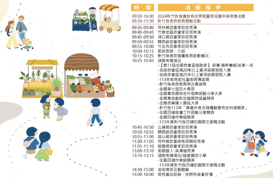 活動當日將表揚榮獲「農會屆滿20年、25年以上資深績優服務人員」、「113年教育部社會教育貢獻獎」、「新竹縣食農教育傑出貢獻獎」、「全國第七屆百大青農」、「全國青農團隊合作個案經驗分享大賽」、「新竹縣113年國產米食及雜糧創意特色料理競賽」、「全國四健作業組競賽」之優秀人員。