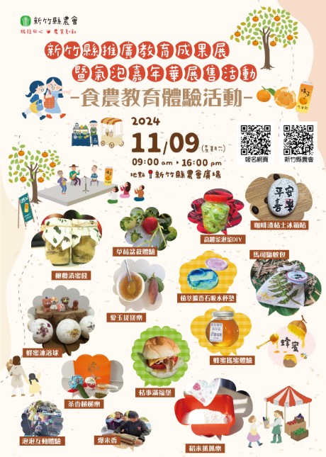 「2024新竹縣推廣教育成果展暨氣泡嘉年華展售活動」由新竹縣政府農業處輔導、新竹縣農會主辦,將於本周六(11月9日)上午在新竹縣農會廣場登場。新竹縣長楊文科說,期盼透過本次成果展及多元體驗活動,可以讓民眾一覽新竹縣推動食農、青農、家政、綠照、四健等豐富成果,串聯農村老、中、青世代的傳承,一起為這片土地努力付出,將這份感動傳遞、延續下去。