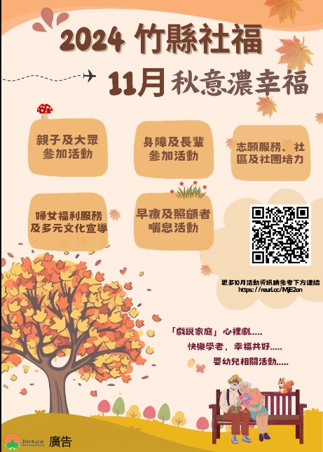 社會處期許透過各式親子互動、文化體驗及關懷活動,促進不同族群、不同世代間的交流與理解,共同營造一個更溫暖、更包容的新竹縣。詳細活動及報名資訊請見「竹縣社福•無限幸福 11月社福活動彙整表」(https://reurl.cc/MjE2on),歡迎縣民踴躍參與,一起在這個秋冬感受滿滿的社福溫暖。