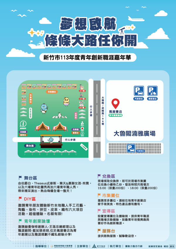 勞青處長林昱志表示,青年創新職涯嘉年華活動有豐富的青創及美食市集,匯集新竹在地許多特色青年創業店家,讓青年朋友能透過市集與店家互動交流,探索多樣化職涯發展路徑。並邀請新竹在地學生社團演出、花式調酒、氣球魔術、花式扯鈴、特技呼拉圈、未央特技等青年職人秀,提供青年一展長才的舞台,且邀請青年喜愛的Theseus忒修斯及伯爵白樂團現場LIVE演出,以及樂天&慕獅女孩熊霓帶來精采舞蹈表演,並分享她的職涯心路歷程。