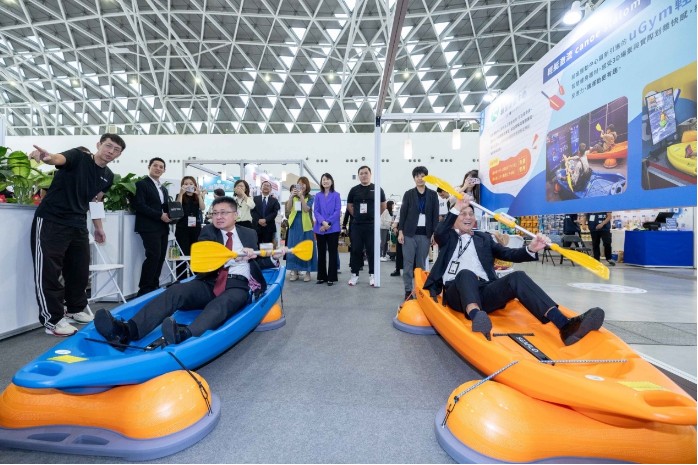 (左)衛生福利部呂建德政務次長與(右)安益集團總裁涂建體驗高雄市政府運動發展局帶來的uGym輕艇激流及划船競賽系統虛擬運動體驗。