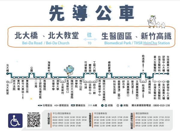 交通處說明,先導公車路線將駛入陽明交通大學校園和新竹科學園區,平日再延駛至生醫園區,在陽明交大校內共計設置來回6個站點,去程設置「竹湖會館」、「體育館」、「工程六館站」,回程設置「綜合一館」、「活動中心」、「竹湖」;科學園區內亦設置來回6個站點,包含「同步輻射中心」(雙向)、「陽明交大光復南門」(雙向)、「緯創資通站」、「科技生活館」,提升學生與園區從業人員乘車便利性與通學效率。