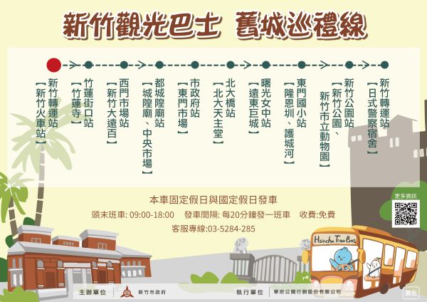 城銷處表示,新竹觀光巴士以新竹火車站後站為起點,串聯舊城區10大站點,包括東門市場、新竹動物園、玻璃工藝博物館、竹蓮寺、進士第等,為旅客提供便捷的觀光交通選擇,深入探索新竹的文化魅力。巴士營運時間為每週末及假日,從上午9點至下午6點,每20分鐘一班,確保旅客能輕鬆搭乘,暢遊新竹。不僅如此,免費又便利的觀光巴士服務,不僅有助於減少個人交通工具使用,降低碳排放,市府也期待藉此吸引更多國內外旅客,透過「慢遊新竹」,感受百年古城的深厚人文底蘊與獨特風采。