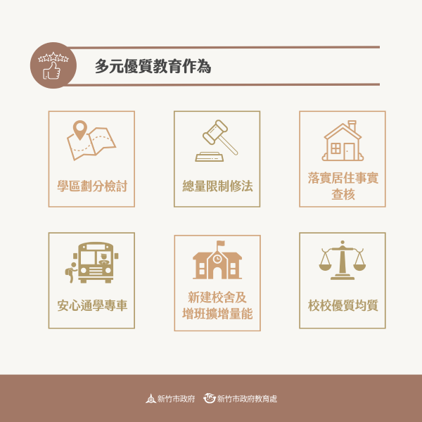 代理市長邱臣遠表示,為確保學生就學需求與教學品質,市府團隊逐步實踐高虹安市長對親師生的承諾,過去兩年積極推動多項措施,包括「重新檢討學區劃分」、「修法加強居住事實查核以保障學區學生就學權益」、「增建校舍及尋覓校地擴增學校招收名額」、「推動安心通學專車」、「規劃新設高中」及「促進校校均質」等政策,讓家長放心,孩子開心。期望透過這些措施,優化教育資源配置,並方便學子就近入學。